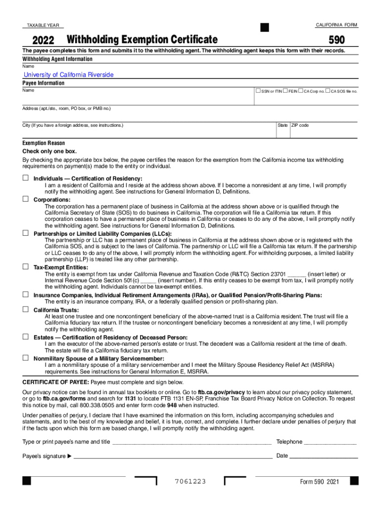 CALIFORNIA FORMIDABLE YEAR2022Withholding Exemption Certificate590The payee completes this form and submits it to the withholding agent. The withholding agent keeps this form with their records. Withholding