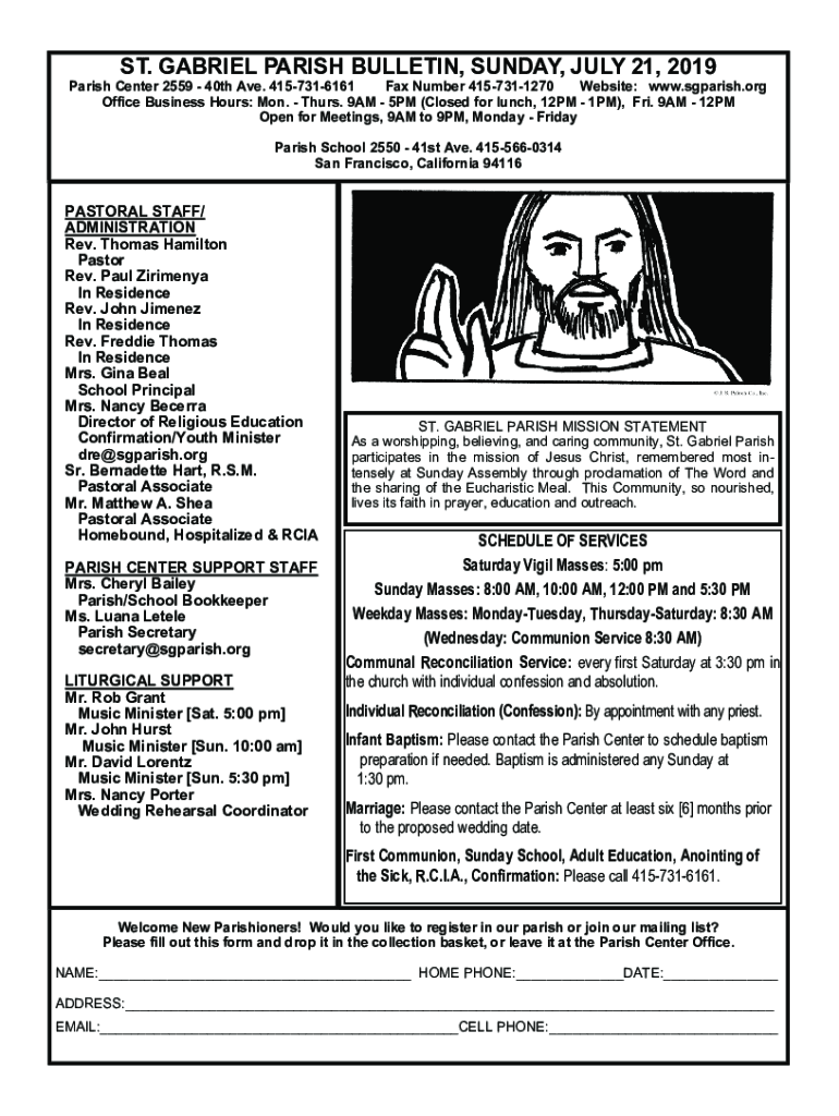 ST. GABRIEL PARISH BULLETIN, SUNDAY, JULY 21, 2019Parish Center 2559 40th Ave. 4157316161 Fax Number 4157311270 Website: www.sgparish.org Office Business Hours: Mon. Thurs. 9AM 5PM (Closed for lunch,