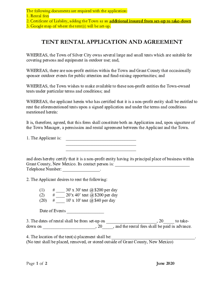 The following documents are required with the application: 1. Rental fees 2. Certificate of Liability, adding the Town as an additional insured from setup to takedown 3. Google map of where the tent(s)