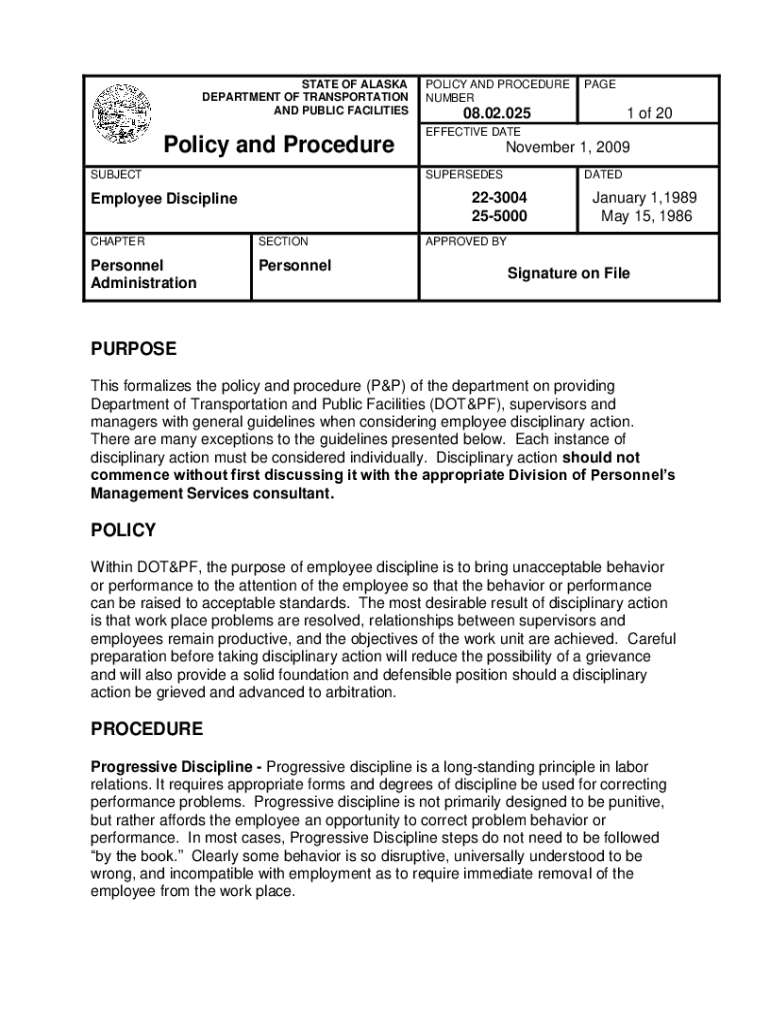 STATE OF ALASKA DEPARTMENT OF TRANSPORTATION AND PUBLIC FACILITIESPolicy and Procedure SUBJECTPOLICY AND PROCEDURE NUMBER08.02.025November 1, 2009 DATED223004 255000CHAPTERSECTIONPersonnel AdministrationPersonnel1