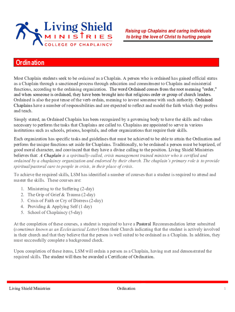 Raising up Chaplains and caring individuals to bring the love of Christ to hurting peopleOrdination Most Chaplain students seek to be ordained as a Chaplain. A person who is ordained has gained official
