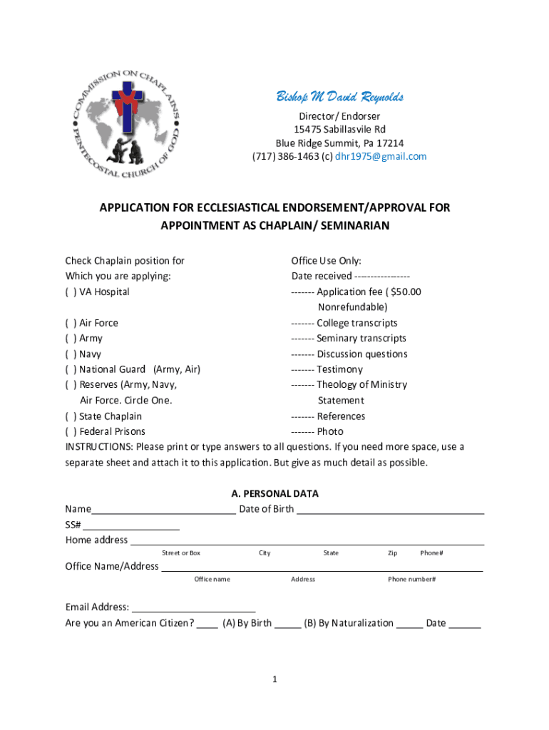 Bishop M David Reynolds Director/ Endorser 15475 Sabillasvile Rd Blue Ridge Summit, Pa 17214 (717) 3861463 (c) dhr1975@gmail.comAPPLICATION FOR ECCLESIASTICAL ENDORSEMENT/APPROVAL FOR APPOINTMENT