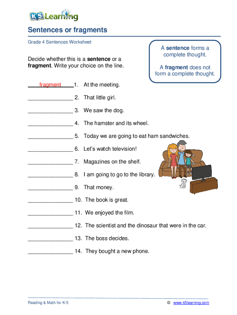 Sentences or fragments Grade 4 Sentences WorksheetDecide whether this is a sentence or a fragment. Write your choice on the line. Fragments sentence forms a complete thought. A fragment does not form