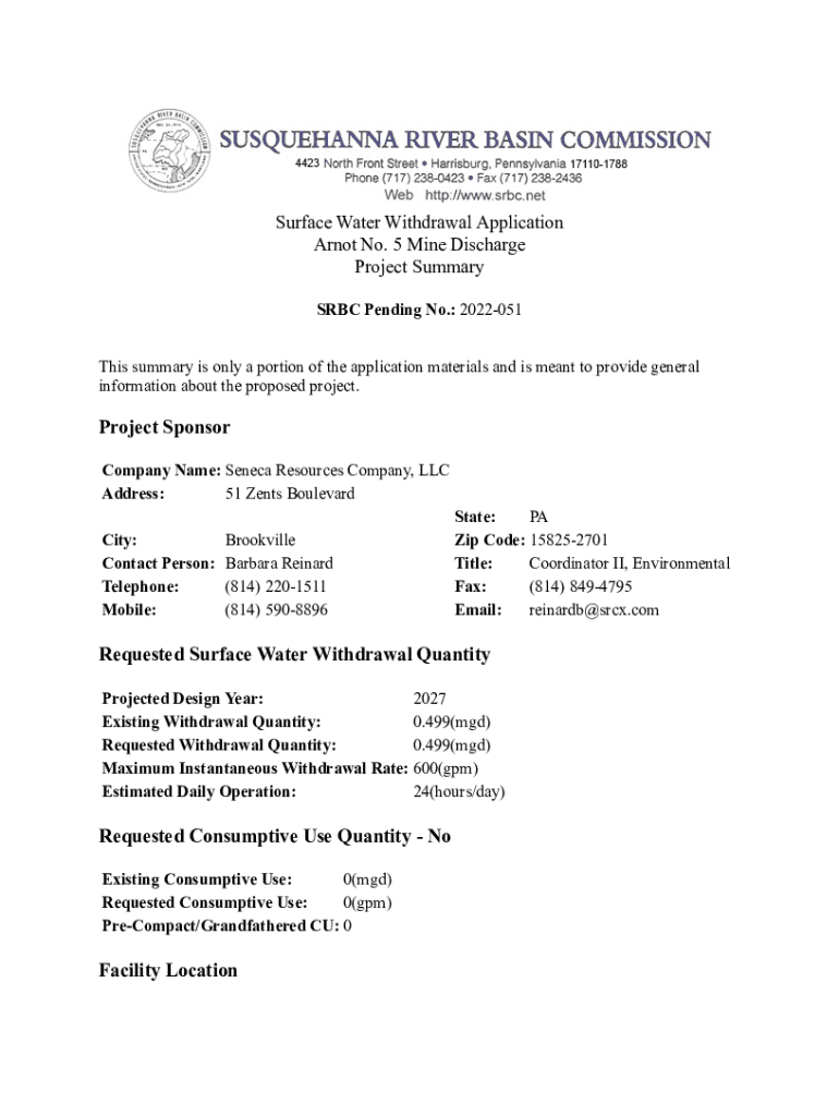 Surface Water Withdrawal Application Arno No. 5 Mine Discharge Project Summary RBC Pending No.: 2022051 This summary is only a portion of the application materials and is meant to provide general