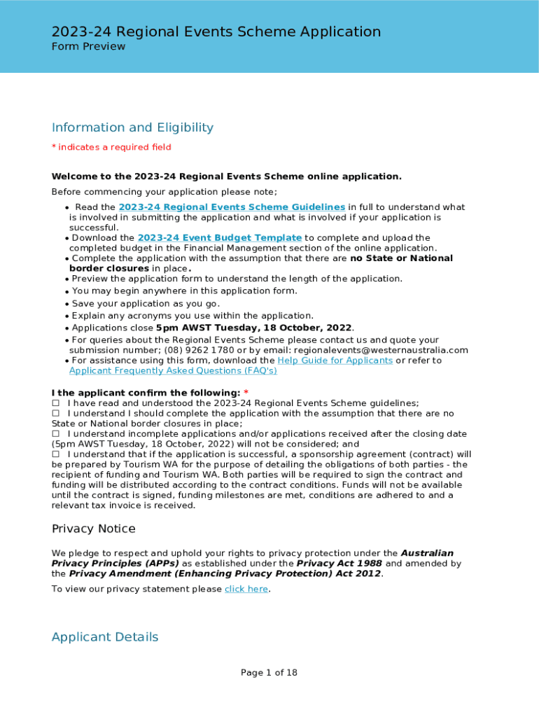 202324 Regional Events Scheme Application Form PreviewInformation and Eligibility * indicates a required ELD Welcome to the 202324 Regional Events Scheme online application. Before commencing your
