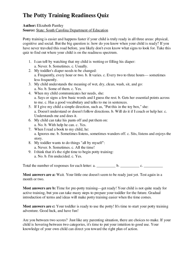 The Potty Training Readiness Quiz Author: Elizabeth Partly Source: State: South Carolina Department of Education Potty training is easier and happens faster if your child is truly ready in all three