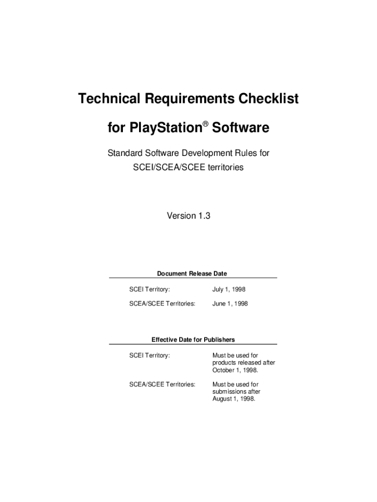 Technical Requirements Checklist for PlayStation Software Standard Software Development Rules for SCSI/SEA/SEE territoriesVersion 1.3Document Release Date SCSI Territory:July 1, 1998SCEA/SEE Territories:June