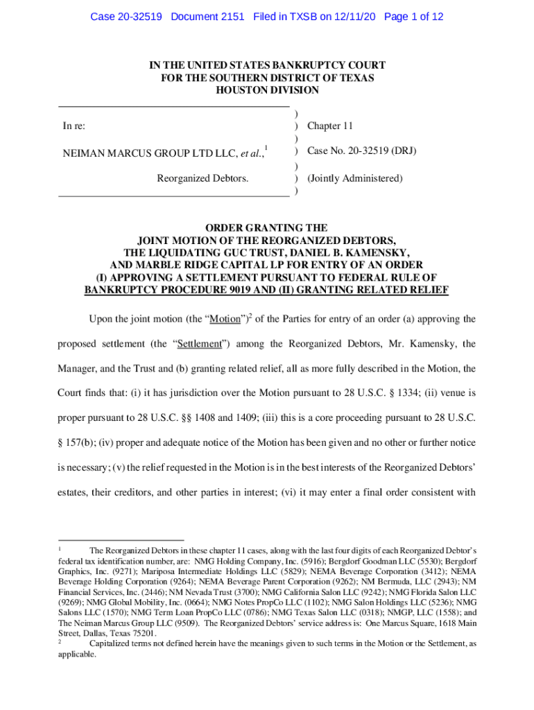 Case 2032519 Document 2151 Filed in TSB on 12/11/20-Page 1 of 12IN THE UNITED STATES BANKRUPTCY COURT FOR THE SOUTHERN DISTRICT OF TEXAS HOUSTON DIVISION In re: 1NEIMAN MARCUS GROUP LTD LLC, et al.,