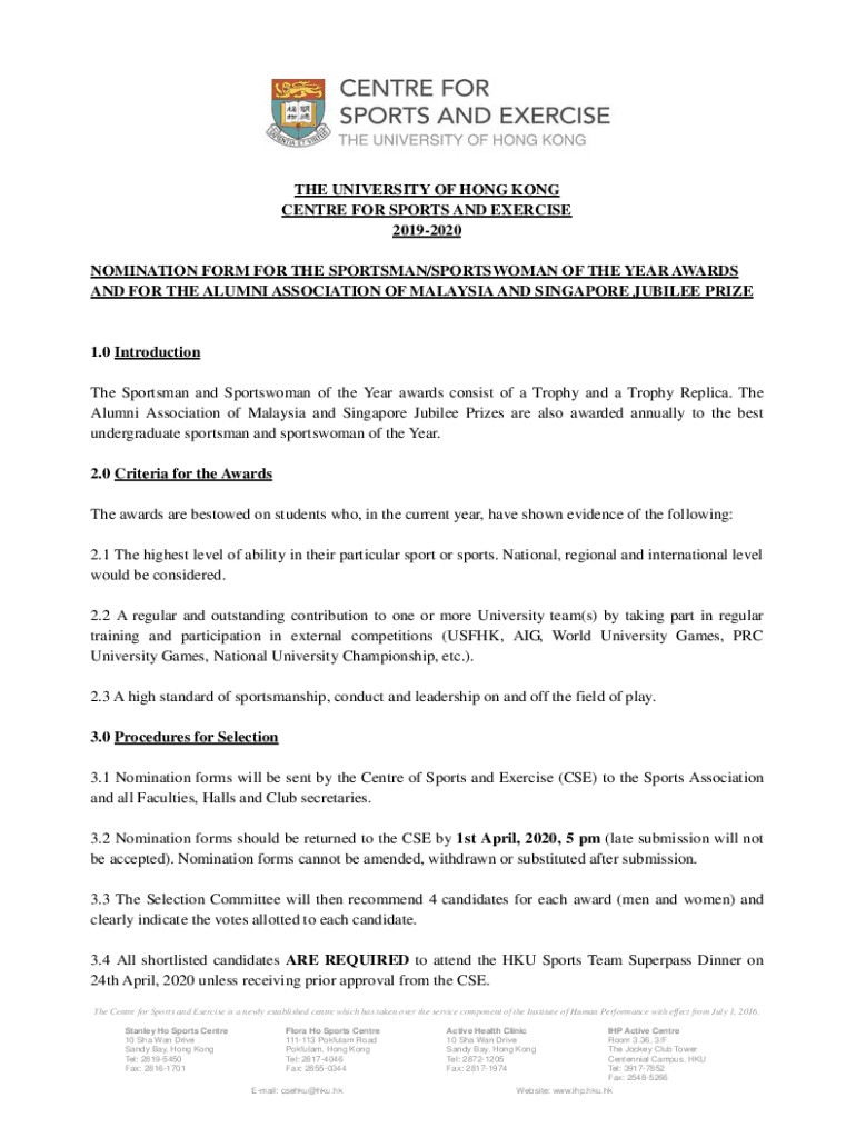 THE UNIVERSITY OF HONG KONG Center FOR SPORTS AND EXERCISE 20192020 NOMINATION FORM FOR THE SPORTSMAN/SPORTSWOMAN OF THE YEAR AWARDS AND FOR THE ALUMNI ASSOCIATION OF MALAYSIA AND SINGAPORE JUBILEE
