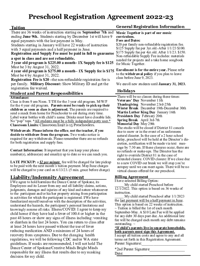 Preschool Registration Agreement 202223 Tuition-free are 36 weeks of instruction starting on September 7th and ending June 9th. Students starting by December 1st will have 9 equal payments with the