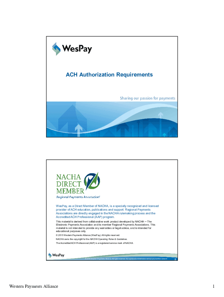 ACH Authorization RequirementsWesPay, as a Direct Member of NACA, is a specially recognized and licensed provider of ACH education, publications and support. Regional Payments Associations are directly