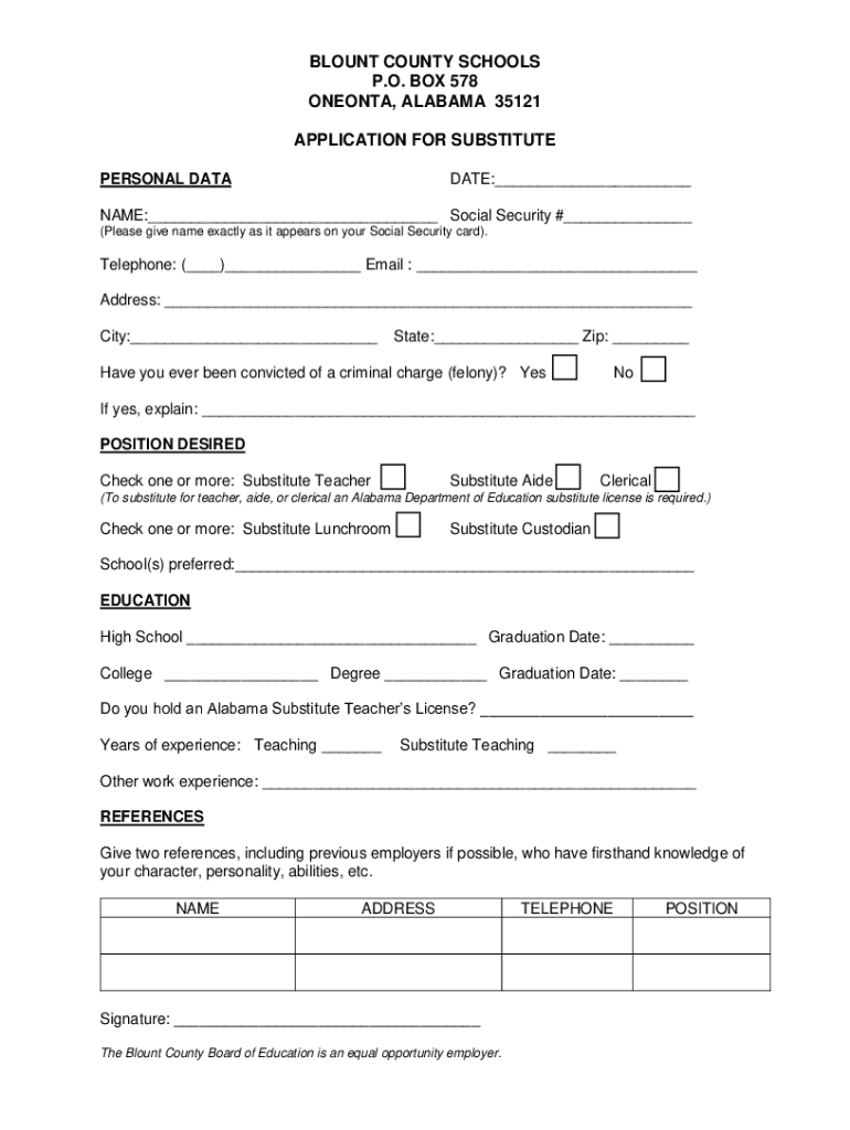 BLUNT COUNTY SCHOOLS P.O. BOX 578 NEON, ALABAMA 35121 APPLICATION FOR SUBSTITUTE PERSONAL DATABASE:___NAME:___ Social Security #___ (Please give name exactly as it appears on your Social Security