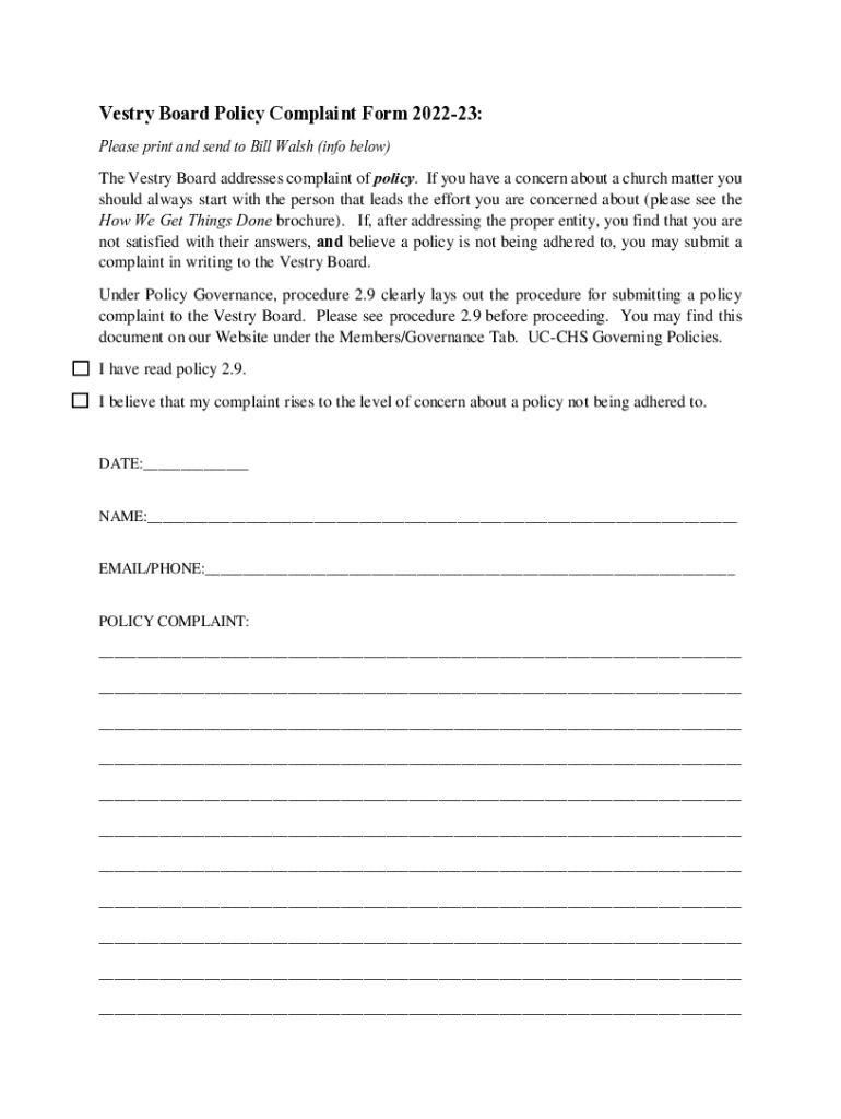 Vestry Board Policy Complaint Form 202223: Please print and send to Bill Walsh (info below)The Vestry Board addresses complaint of policy. If you have a concern about a church matter you should always