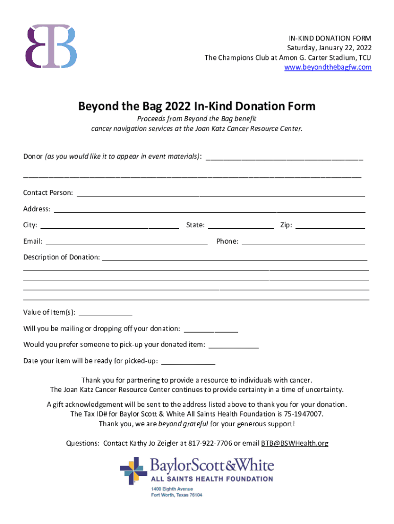 INKING DONATION FORM Saturday, January 22, 2022, The Champions Club at Among G. Carter Stadium, TCU www.beyondthebagfw.comBeyond the Bag 2022 Inking Donation Form Proceeds from Beyond the Bag benefit