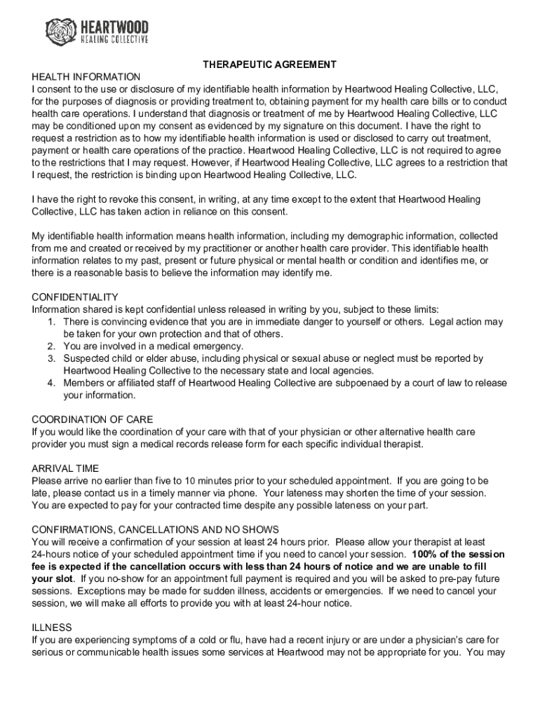 THERAPEUTIC AGREEMENT HEALTH INFORMATION I consent to the use or disclosure of my identifiable health information by Heartwood Healing Collective, LLC, for the purposes of diagnosis or providing treatment