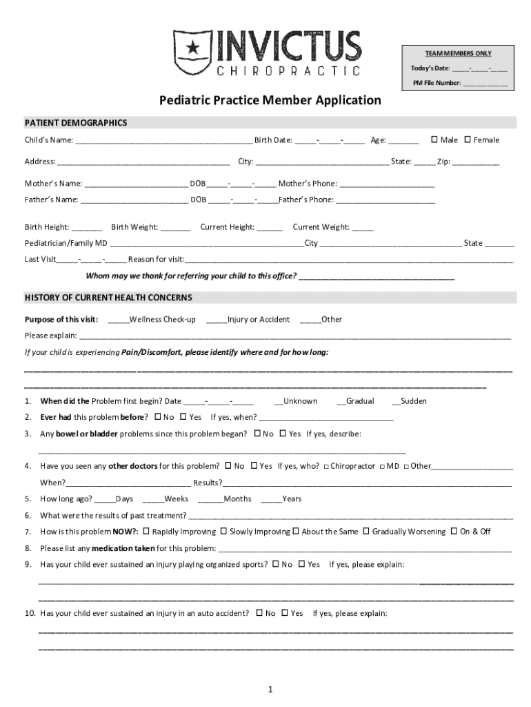 TEAM MEMBERS ONLY Today's Date: _________ PM File Number: ___Pediatric Practice Member Application PATIENT DEMOGRAPHICS Child's Name: ___ Birth Date: _________ Age: ___ Male FemaleAddress: ___ City:
