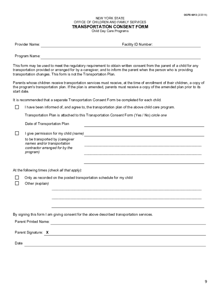 OFFS 6013 (2/2015)NEW YORK STATE OFFICE OF CHILDREN AND FAMILY SERVICESTRANSPORTATION CONSENT FORM Child Day Care ProgramsProvider Name:Facility ID Number:Program Name: This form may be used to meet