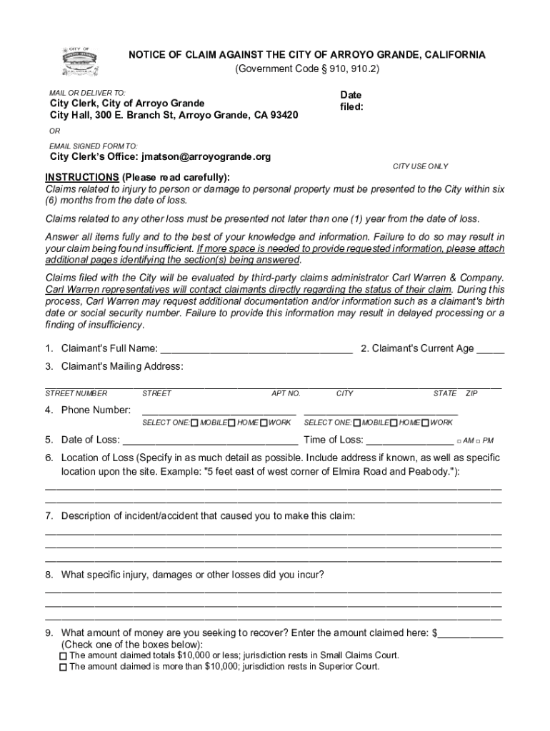 Get the free NOTICE OF CLAIM AGAINST THE CITY OF ARROYO GRANDE ...