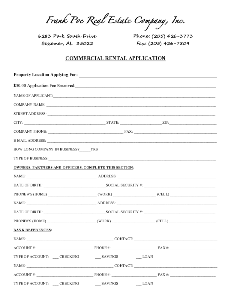 Frank Poe Real Estate Company, Inc. 6283 Park South Freephone: (205) 4263773Bessemer, AL 35022Fax: (205) 4267809COMMERCIAL RENTAL APPLICATION Property Location Applying For: ___ $30.00 Application
