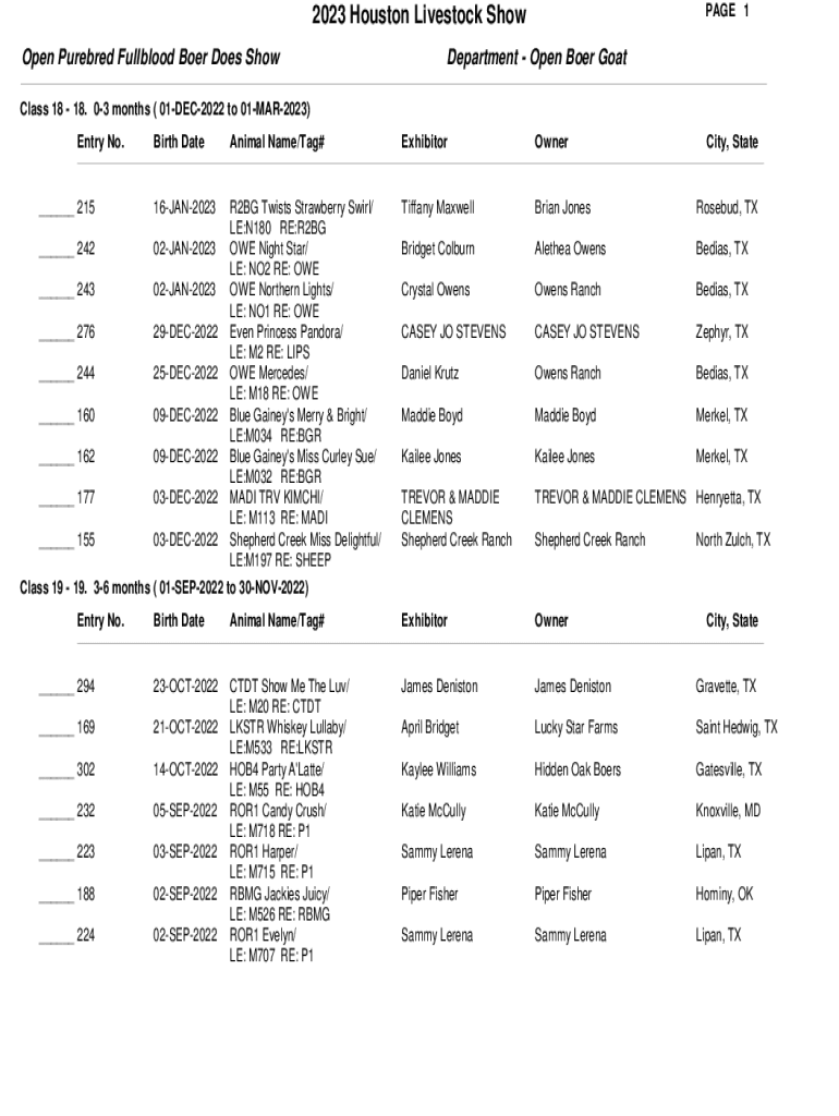 PAGE 12023 Houston Livestock Show Open Purebred Full blood Boer Does ShowDepartment Open Boer Outclass 18 18. 03 months (01DEC2022 to 01MAR2023) Entry No. Birth Satanical Name/Tag#ExhibitorOwner___