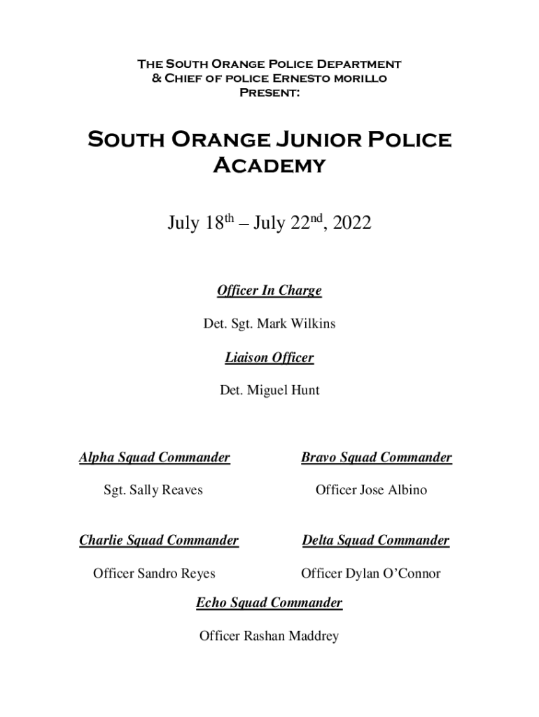 The South Orange Police Department & Chief of police Ernesto Murillo Present:South Orange Junior Police Academy July 18th July 22nd, 2022Officer In Charge DET. Sgt. Mark Wilkins Liaison Officer DET.