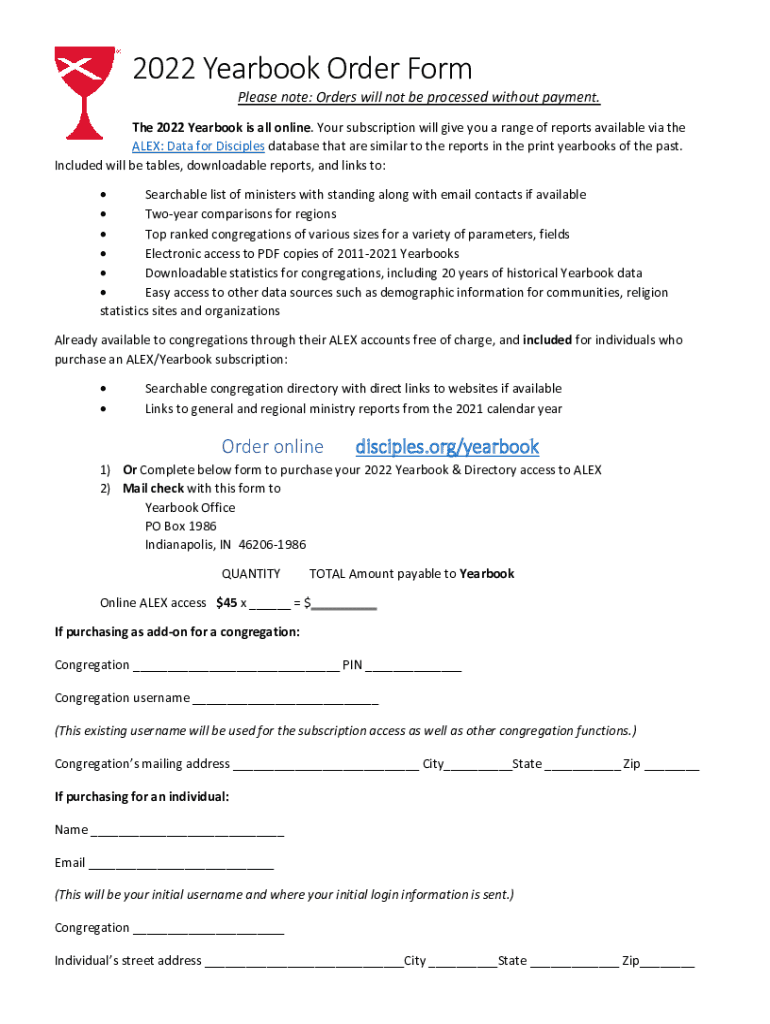 2022 Yearbook Order Form Please note: Orders will not be processed without payment. The 2022 Yearbook is all online. Your subscription will give you a range of reports available via the ALEX: Data