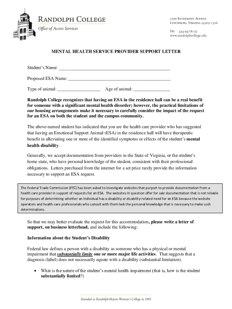 MENTAL HEALTH SERVICE PROVIDER SUPPORT LETTER Students Name: ___ Proposed ESA Name: ___ Type of animal: ___Age of animal: ___Randolph College recognizes that having an ESA in the residence hall can
