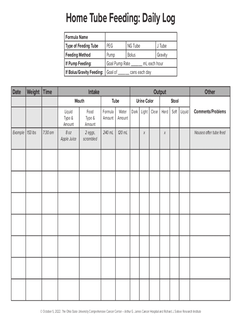 Formula NameDateType of Feeding TubePEGNG Tube TubeFeeding MethodPumpBolusGravityIf Pump Feeding:Goal Pump Rate ___ mL each houri Bolus/Gravity Feeding:Goal of ___ cans