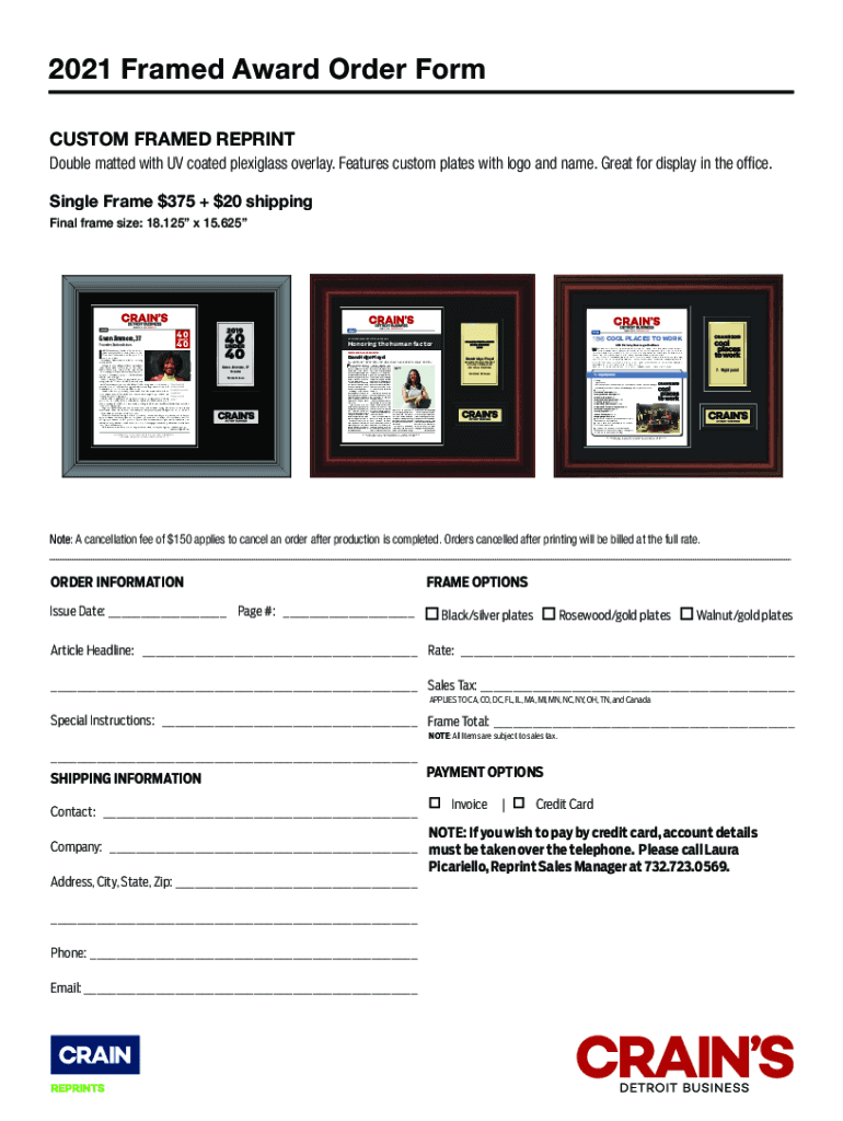 2021 Framed Award Order Form CUSTOM FRAMED REPRINT Double matted with UV coated plexiglass overlay. Features custom plates with logo and name. Great for display in the office. Single Frame $375 +