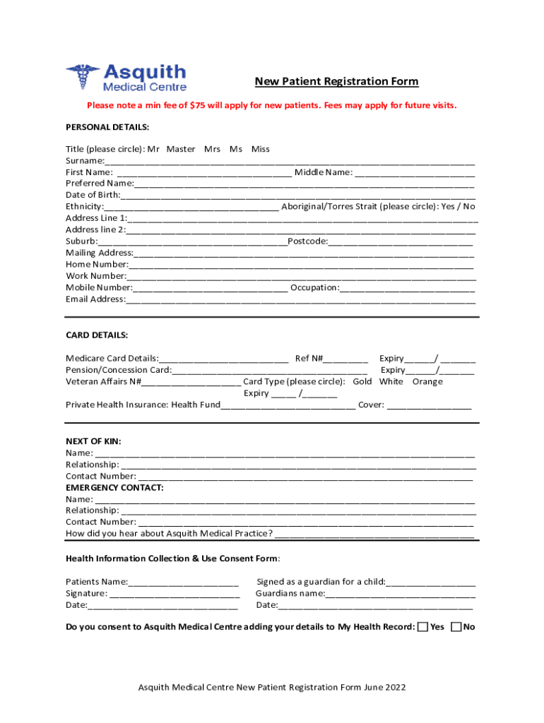 New Patient Registration Form Please note a min fee of $75 will apply for new patients. Fees may apply for future visits. PERSONAL DETAILS: Title (please circle): Mr Master Mrs Ms Miss Surname:___