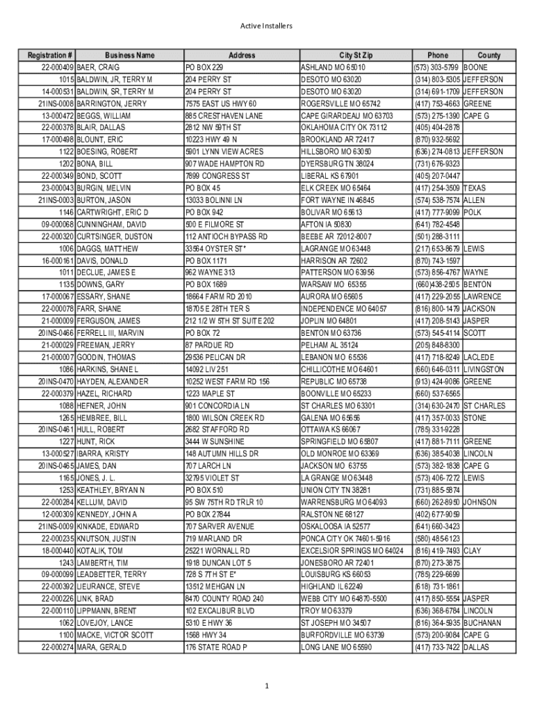 Active Installers Registration # 22000409 1015 14000531 21INS0008 13000472 22000378 17000498 1122 1202 22000349 23000043 21INS0003 1146 09000068 22000320 1006 16000161 1011 1135 17000067 22000078