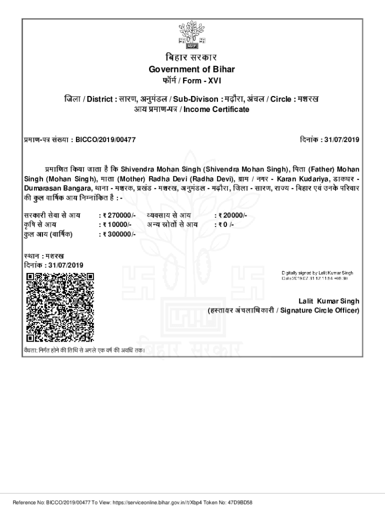 Government of Bihar / Form XVI / District :, / Subdivision :, / Circle : / Income Certificate : BI CCO/2019/00477 : 31/07/2019 Dhirendra Moran Singh (Dhirendra Moran Singh), (Father) Moran Singh (Moran