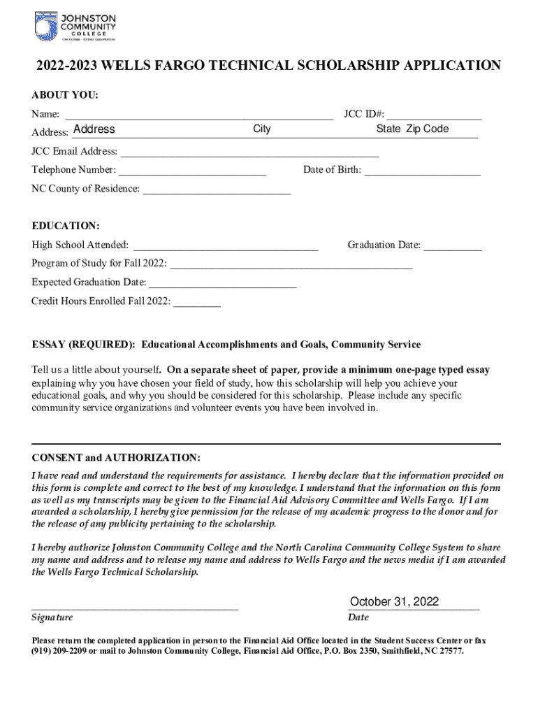 20222023 WELLS FARGO TECHNICAL SCHOLARSHIP APPLICATION ABOUT YOU: Name: ___ JCC ID#: ___ City State Zip Code Address: ___ JCC Email Address: ___ Telephone Number: ___Date of Birth: ___NC County of