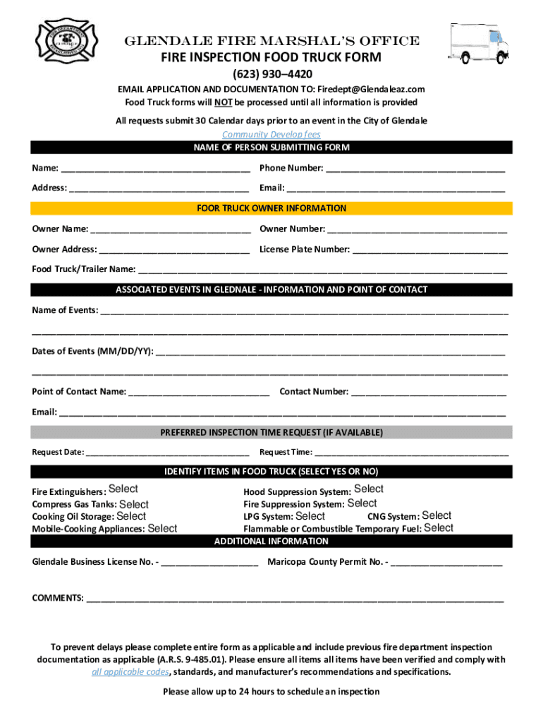 GLENDALE FIRE MARSHALS OFFICER INSPECTION FOOD TRUCK FORM (623) 9304420 EMAIL APPLICATION AND DOCUMENTATION TO: Firedept@Glendaleaz.com Food Truck forms will NOT be processed until all information