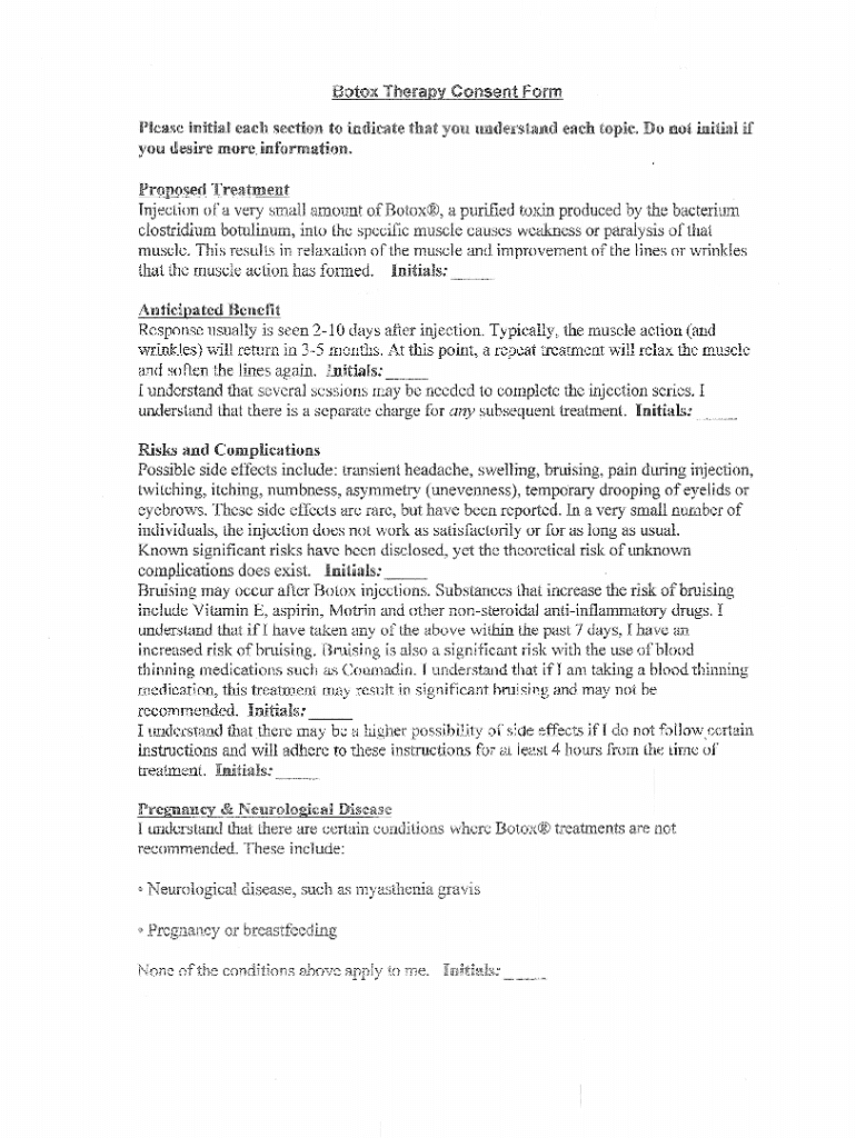 Therapy Consent Form Please initial each section to indicate that you understand you desire more. Information.each topic. Do not initial proposed Treatment Injection of a very small amount of, a purified