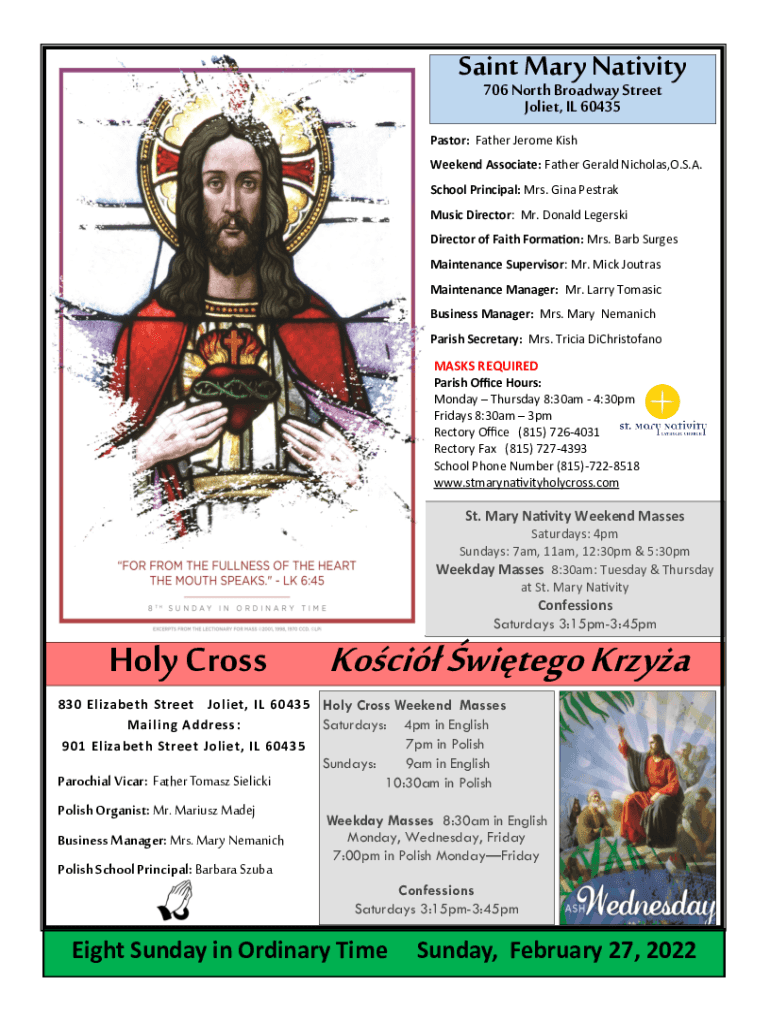 Saint Mary Nativity 706 North Broadway Street Joliet, IL 60435Pastor: Father Jerome Fish Weekend Associate: Father Gerald Nicholas, O.S.A. School Principal: Mrs. Gina Petra Music Director: Mr. Donald