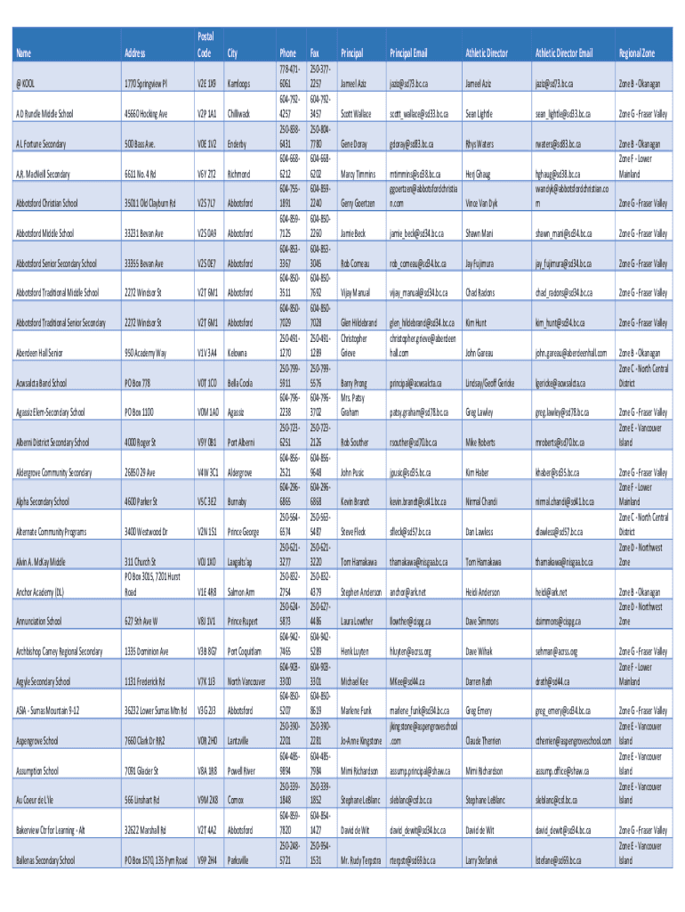NameAddressPostal CodeCity@ KOOL1770 Spring view PlV2E 1×9KamloopsA D Bundle Middle School45660 Hocking AveV2P 1A1ChilliwackA L Fortune Secondary500 Bass Ave. V0E 1V2EnderbyA. R. Mac Neill Secondary6611