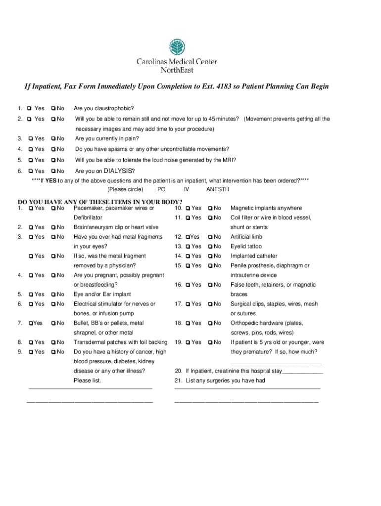 If Inpatient, Fax Form Immediately Upon Completion to Ext. 4183 so Patient Planning Can Begin 1. Yes Are you claustrophobic?2. Yes No Will you be able to remain still and not move for up to 45 minutes?