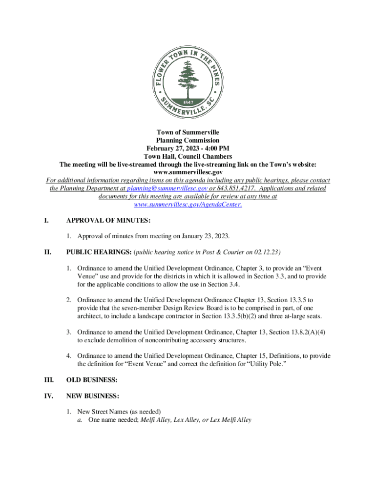 Town of Summerville Planning Commission February 27, 2023 4:00 PM Town Hall, Council Chambers The meeting will be livestreamed through the livestreaming link on the Towns website: www.summervillesc.gov