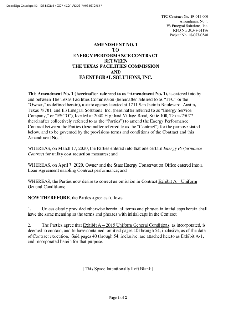DocuSign Envelope ID: 13615CD44CC74E2FAEE67A0346727517TFC Contract No. 19048000 Amendment No. 1 E3 Integral Solutions, Inc. RFQ No. 303801186 Project No. 180230540AMENDMENT NO. 1 TO ENERGY PERFORMANCE