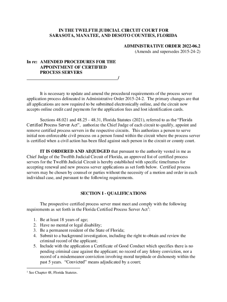 IN THE TWELFTH JUDICIAL CIRCUIT COURT FOR SARASOTA, MANATEE, AND DeSoto COUNTIES, FLORIDA ADMINISTRATIVE ORDER 202206.2 (Amends and supersedes 2015242) In re: AMENDED PROCEDURES FOR THE APPOINTMENT