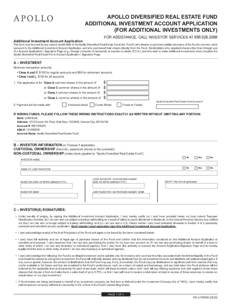 APOLLO DIVERSIFIED REAL ESTATE FUND ADDITIONAL INVESTMENT ACCOUNT APPLICATION (FOR ADDITIONAL INVESTMENTS ONLY) FOR ASSISTANCE, CALL INVESTOR SERVICES AT 888.926.2688Additional Investment Account