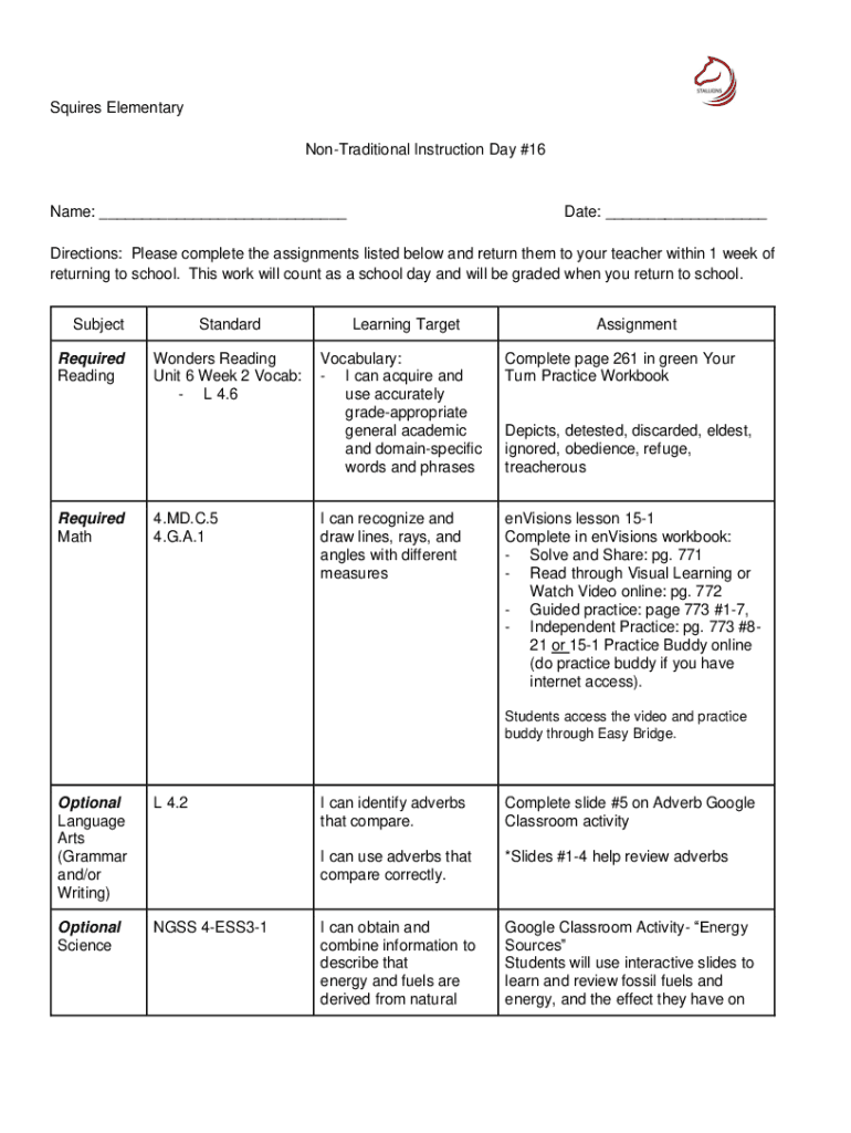 Nontraditional Instruction Day #16Name: ___Date: ___Directions: Please complete the assignments listed below and return them to your teacher within 1 week of