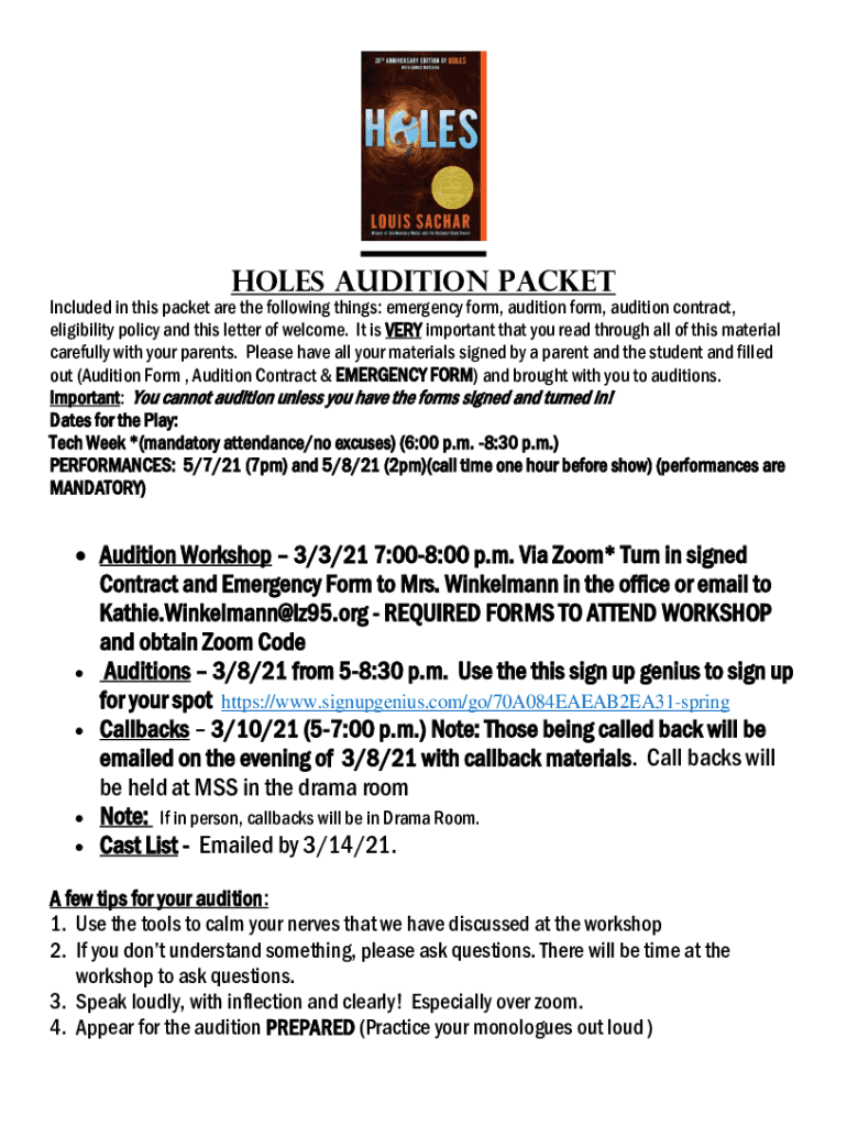 HOLES AUDITION PACKET Included in this packet are the following things: emergency form, audition form, audition contract, eligibility policy and this letter of welcome. It is VERY important that you