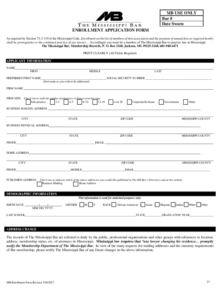 MB USE ONLY Bar # Date Sworn ENROLLMENT APPLICATION FORM As required by Section 733119 of the Mississippi Code, Enrollment on the list of members of this association and the payment of annual fees