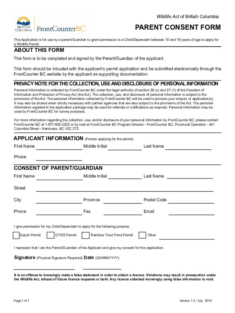 Wildlife Act of British ColumbiaParent consent from This Application is for use by a parent/Guardian to grant permission to a Child/Dependent between 10 and 18 years of age to apply for a Wildlife