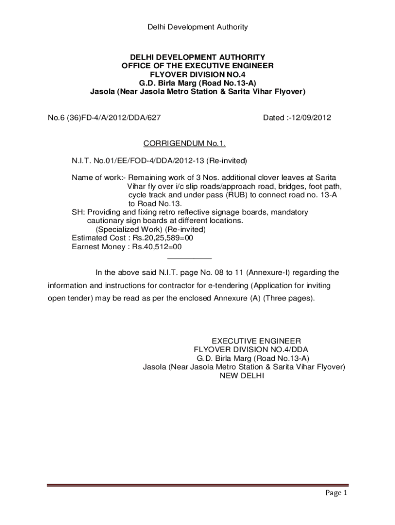 Delhi Development AuthorityDELHI DEVELOPMENT AUTHORITY OFFICE OF THE EXECUTIVE ENGINEER FLYOVER DIVISION NO.4 G.D. Barley Mary (Road No.13A) Jason (Near Jason Metro Station & Sari ta Vicar Flyover)No.6
