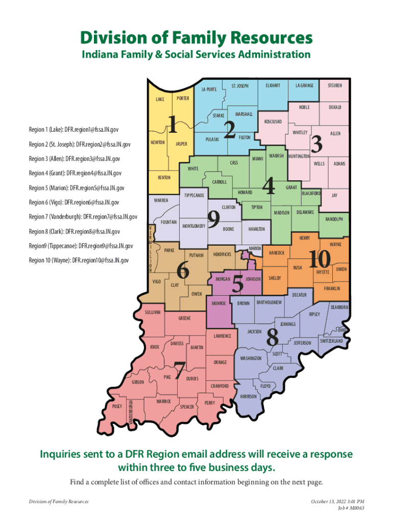 Division of Family Resources Indiana Family & Social Services AdministrationRegion 1 (Lake): DFR.region1@fssa.IN.gov NEWTON1PULASKI2JASPERBENTONRegion9 (Tippecanoe): DFR.region9@fssa.IN.gov Region