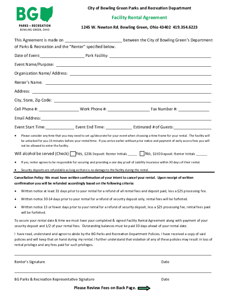 City of Bowling Green Parks and Recreation DepartmentFacility Rental Agreement 1245 W. Newton Rd. Bowling Green, Ohio 43402 419.354.6223 This Agreement is made on ___ between the City of Bowling Greens