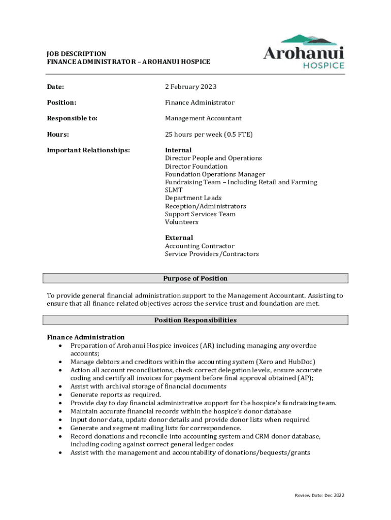 JOB DESCRIPTION FINANCE ADMINISTRATOR ASHANTI HOSPICE Date:2 February 2023Position:Finance AdministratorResponsible to:Management AccountantHours:25 hours per week (0.5 FTE)Important Relationships:Internal